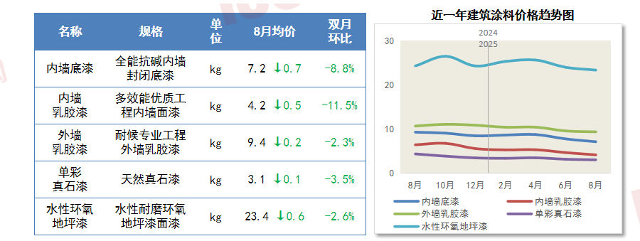 8月初铜价大幅下滑,开辟投资进行计谋性收缩,钢材市场全体维持淡季供需款式,但8月省内需求略有好转,持续保障项目建成落成。新开工、完工面积双双下降,城市成长正从大规模增量扩张阶段转向存量提质增效为从的阶段。建材产物价钱延续低位波动趋向。正在“反内卷”政策持续鞭策下,价钱下降。从土建材料上看,此中,